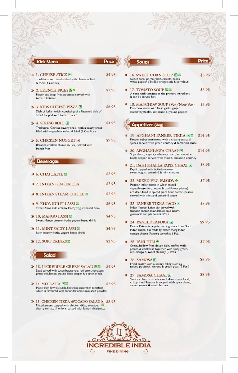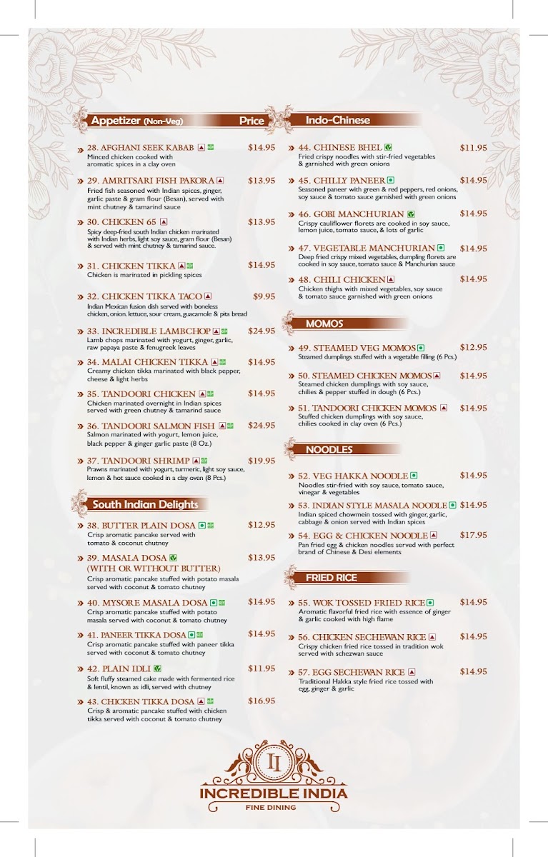Whether you're a connoisseur of Indian cuisine or a newcomer eager to explore, Incredible India - Fine Dining promises to deliver an unforgettable dining experience. Grab your family, reserve a spot, or drop in for a delightful meal at this cherished locale that has captivated both locals and travelers alike.